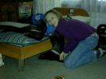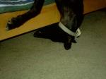 Hey, that's a new position. Haven't seen that one yet. L'il Bullet has mastered the cockroach, and is now "tent sleeping" as well as making himself a "bumper" and "headboard" around his crate. Murphy won't cockroach at all. He doesn't find it dignified. He either sleeps in the "anchor" or on his side.